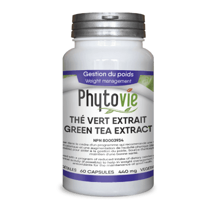 Medicinal Ingredient:Each capsule contains 440 mg leaf extract standardized at 17% (-)-epigallocatechin-3-gallate (EGCG) and 5% caffeine of Camellia sinensis (Green tea).