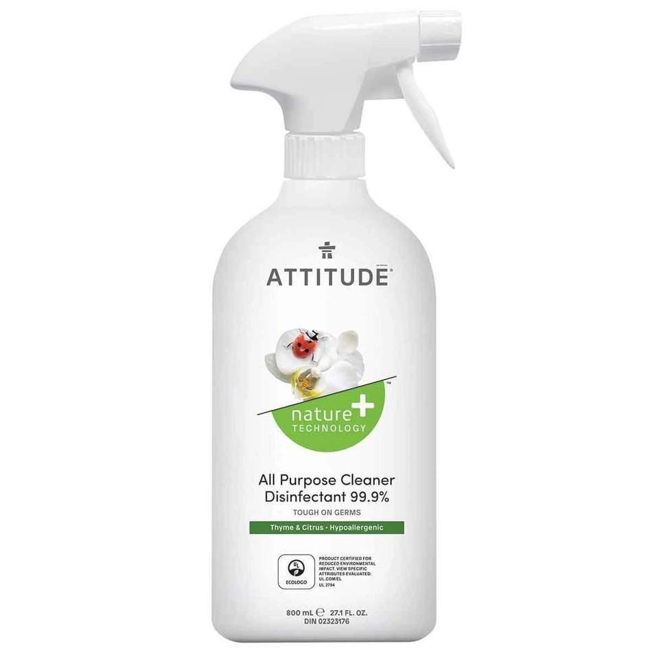 Keep household germs away with ATTITUDE’s Nature + TechnologyTM All Purpose Cleaner Disinfectant 99.9% – Thyme & Citrus.