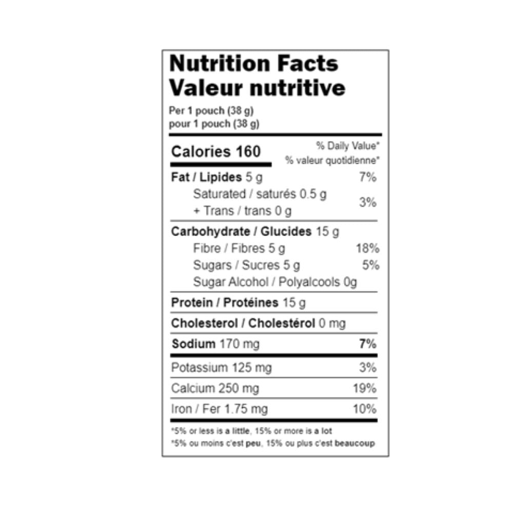 Soy protein isolate, Sugar, Sunflower oil, Corn maltodextrin fibre, Rice flour, Tapioca starch, Oligofructose, Apple peel powder, Calcium carbonate, Cinnamon, Natural and artificial flavours, Sucralose (17 mg per packet (38 g)).