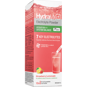 Meet Hydralyte+ System Balance! Rehydrating solution with Promitor®! Each serving promotes a healthy digestive system, contributes to bone health, stimulates healthy bacteria in the large intestine PLUS 7 key electrolytes for rehydration. Each box contains 10 single servings in our newest strawberry lemonade flavor.