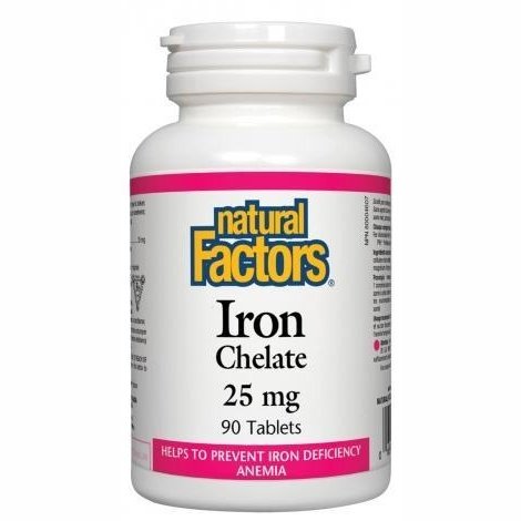Natural Factors Iron Chelate 25 mg is a factor in the formation and proper function of red blood cells. It helps prevent iron deficiency anemia and maintain good health. The iron is chelated, allowing it to be more readily absorbed and metabolized by the body, making it an ideal choice for those with low stomach acid or other digestive issues.