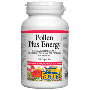 Natural Factors Pollen Plus Energy provides the best of the bee in a combination formula of bee pollen plus standardized extracts of Siberian ginseng, bee propolis, and green tea. Each active ingredient is highly regarded, but the synergistic effect of these classic nutrients and herbs provides valuable nutritional insurance for coping with the demands and stress of daily life.