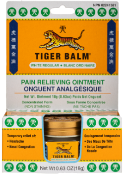 Tiger Balm White is effective for headaches, stuffy nose, stomach flatulence, insect bites, itchiness and muscle and joint aches.
