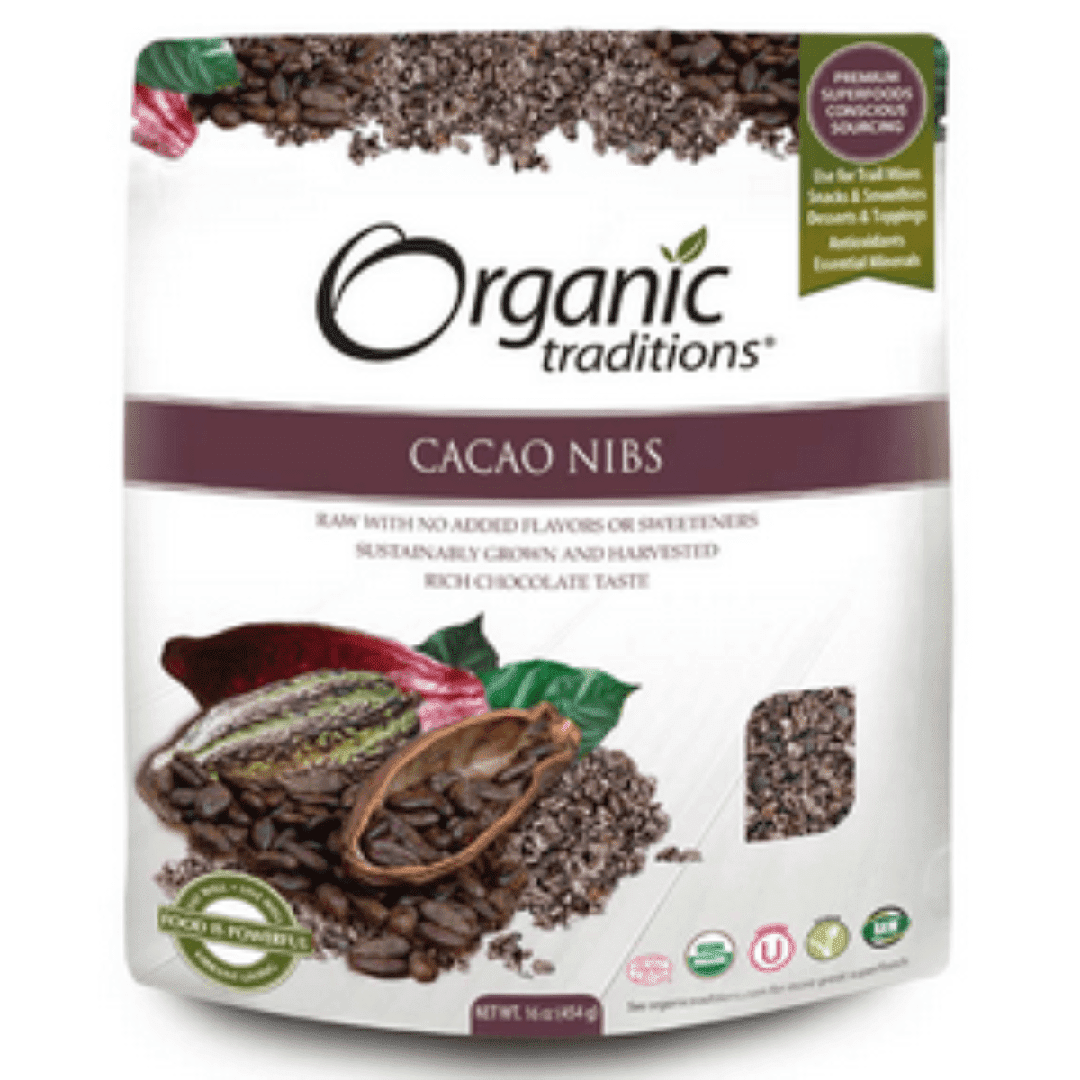 Cacao was once so revered by the Mayans and the Aztecs that it was used as currency. Flavored with chilies, vanilla, cinnamon, nutmeg and other spices, the beans were traditionally ground into a paste to make delicious chocolate dishes and ceremonial drinks. A true superfood, Cacao nibs are a source of Potassium and a very high source of Fiber. Cacao also contains essential minerals and a host of antioxidants, giving it an ORAC value of 8,400 per 4 tbsp. 30 gram serving. While most cacao nibs are roasted, Organic Traditions Cacao nibs are raw with no added flavors or sweeteners.