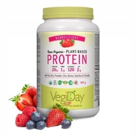VegiDay Raw Organic Plant-Based Protein is a 100% vegan Berrylicious protein powder featuring pea, rice, pumpkin, chia, quinoa, spirulina, and chlorella. Packed with phytonutrients, this non-GMO, soy- and gluten-free formula contains 20 g of protein per serving, and can be easily added to shakes and blender drinks.