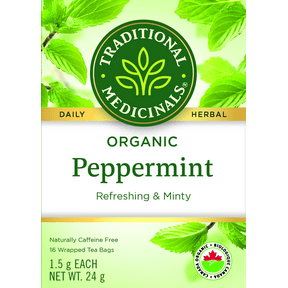 Ingredients: Each tea bag (1.5 g) contains: organic peppermint leaf (Mentha × piperita) 1,500 mg.