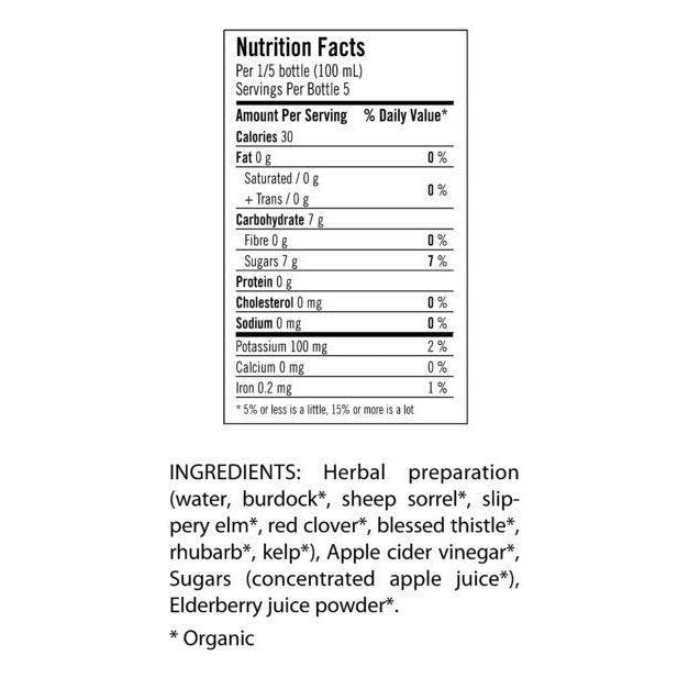 Herbal preparation (water, ginger*, burdock*, sheep sorrel*, slippery elm*, red clover*, blessed thistle*, rhubarb*, kelp*), Apple cider vinegar*, Sugars (concentrated apple juice*), Natural lemon flavour.