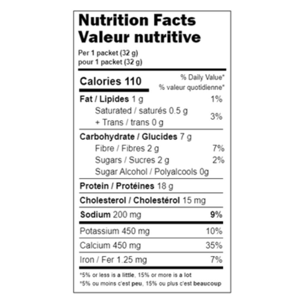 Milk protein concentrate, Cocoa powder, Milk protein isolate, Guar gum, Cocoa extract, Sea salt, Natural flavours, Silicon dioxide, Xanthan gum, Sucralose (42 mg per packet (32 g)).