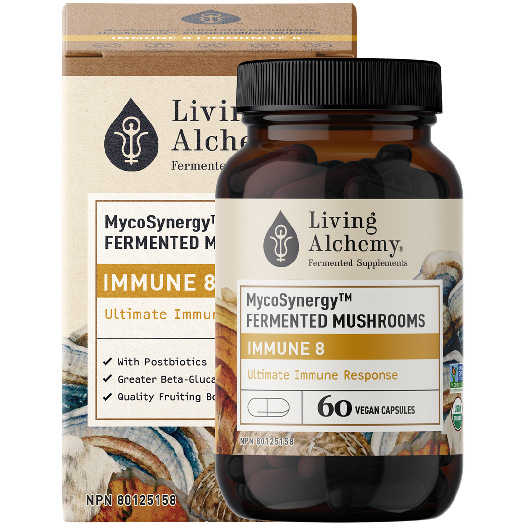 Living Alchemy MycoSynergy Fermented Mushrooms Immune 8 Capsules feature a powerful blend of fermented mushrooms, designed to naturally strengthen your immune system.